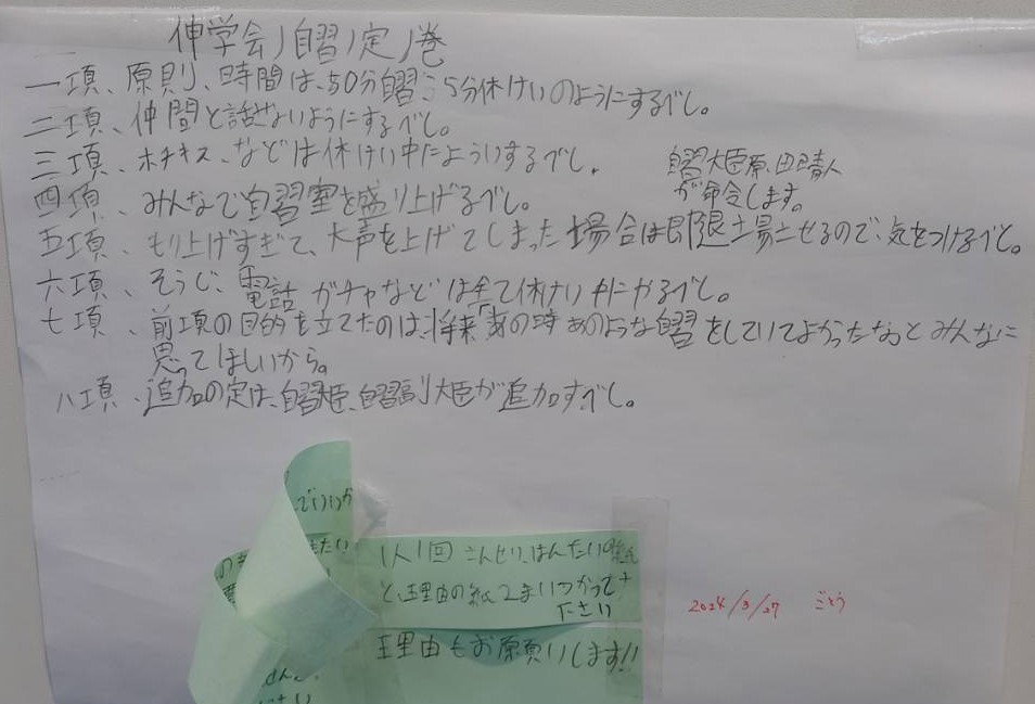 伸学会でも↓の様な感じで、生徒たちにルール作りに関わらせています。